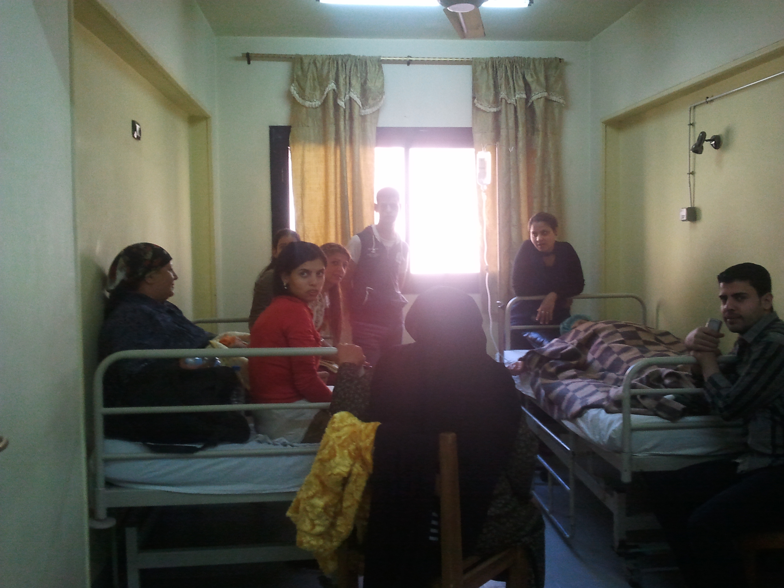 My room is in the hospital building, and today I have already seen that there are also administrative offices on my floor. Sr. Marina begins with surgery and admissions, on the first floor. My first impression is of friendly chaos. Today is a Sunday, officially a holiday, but that doesn’t matter here at the hospital. Patients, visitors, I don’t know who all, are all sitting on the sandy stairs. Since many of them are men and some are smoking, I figure they’re on the steps so that the men can smoke. I see Muslims and Copts. Everyone smiles at me, a woman in a black gallabia, her head completely covered except for her eyes peering through glasses, touches me on the shoulder and says in English, “Welcome”. Her eyes are smiling, merry. And suddenly I am inside the operating theaters. There are five in this hospital. There are also a few rooms where patients can stay as in-patients. Those rooms are spilling over with visitors. In one room I count nine visitors visiting a child.