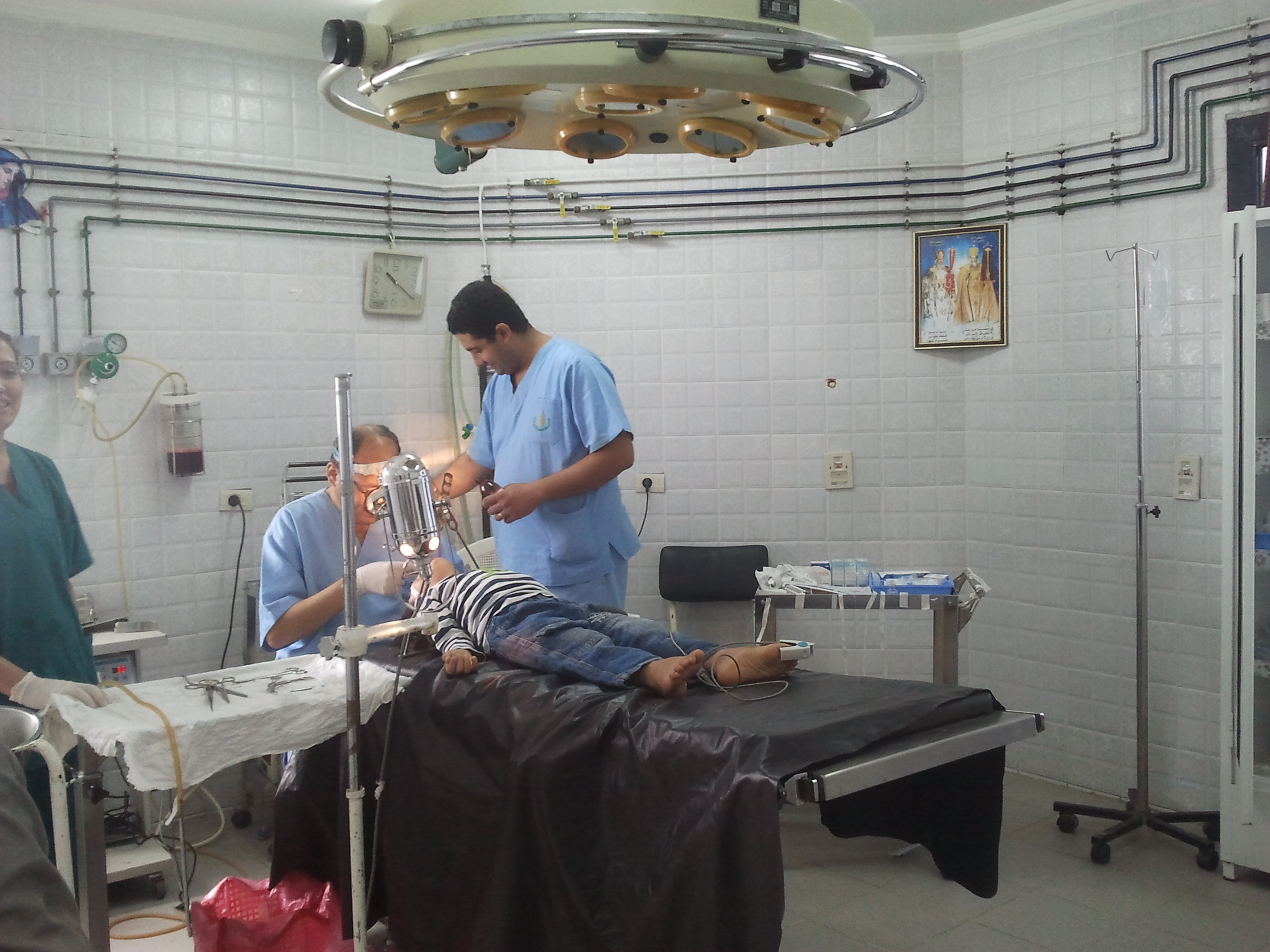 I see that all the equipment is sterilized, and that is reassuring. I am also told that I have to put plastic covers over my shoes when I walk in the operating area. The doctors are dressed in spiffy scrubs and would fit into any hospital in the west. In all other respects, though, this hospital is unlike any I have ever seen. In a corner of the each floor where operations take place there is an altar with burning candles, and plastic flower-framed pictures of a blonde Jesus, the now deceased Coptic pope Shenouda and other figures I don’t recognize. Inside and surrounding the doors of each room thee is always at least one picture taped to the wall – of Mary, Jesus, Pope Shenouda or other holy figures in the Coptic church.