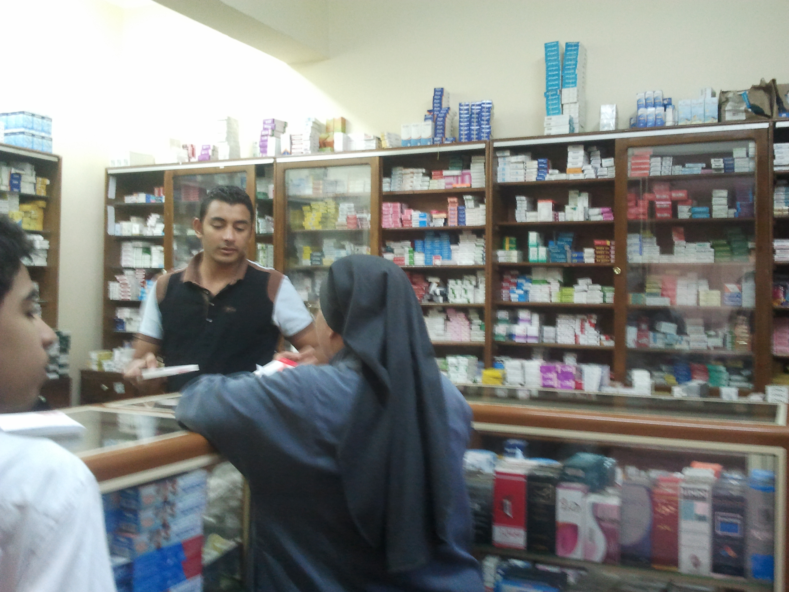 Sr. Marina and Dr. Beshoy take me outdoors to other buildings. I see a pharmacy. Someone is buying medication on a Sunday.