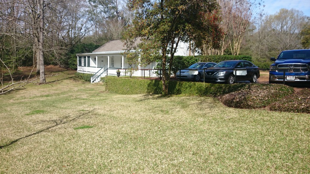 We wake up to glorious sunshine. And we need to get going, or we’re not going to see much of Natchez! Breakfast is in some building away from the main house. We use the map the staff provided us to find our way to the breakfast building. Yesterday was drizzly, no good day to do sightseeing, but today is perfect! Not only is the sun smiling down on us, the weather is warm! I’m finally getting to experience a warm Southern day. The grounds are gorgeous, like walking through a manicured park. We pass a pond with a fountain in the middle, and a bridge, an inviting little pagoda. There are magnolia trees in full bloom – in February! Every now and then we pass a piece of sculpture. We spot pretty white lawn chairs placed strategically around the grounds, as though beckoning us to stay a while and rest here. But sadly, we must move on. We’re already almost too late for breakfast, and we still have to check out.