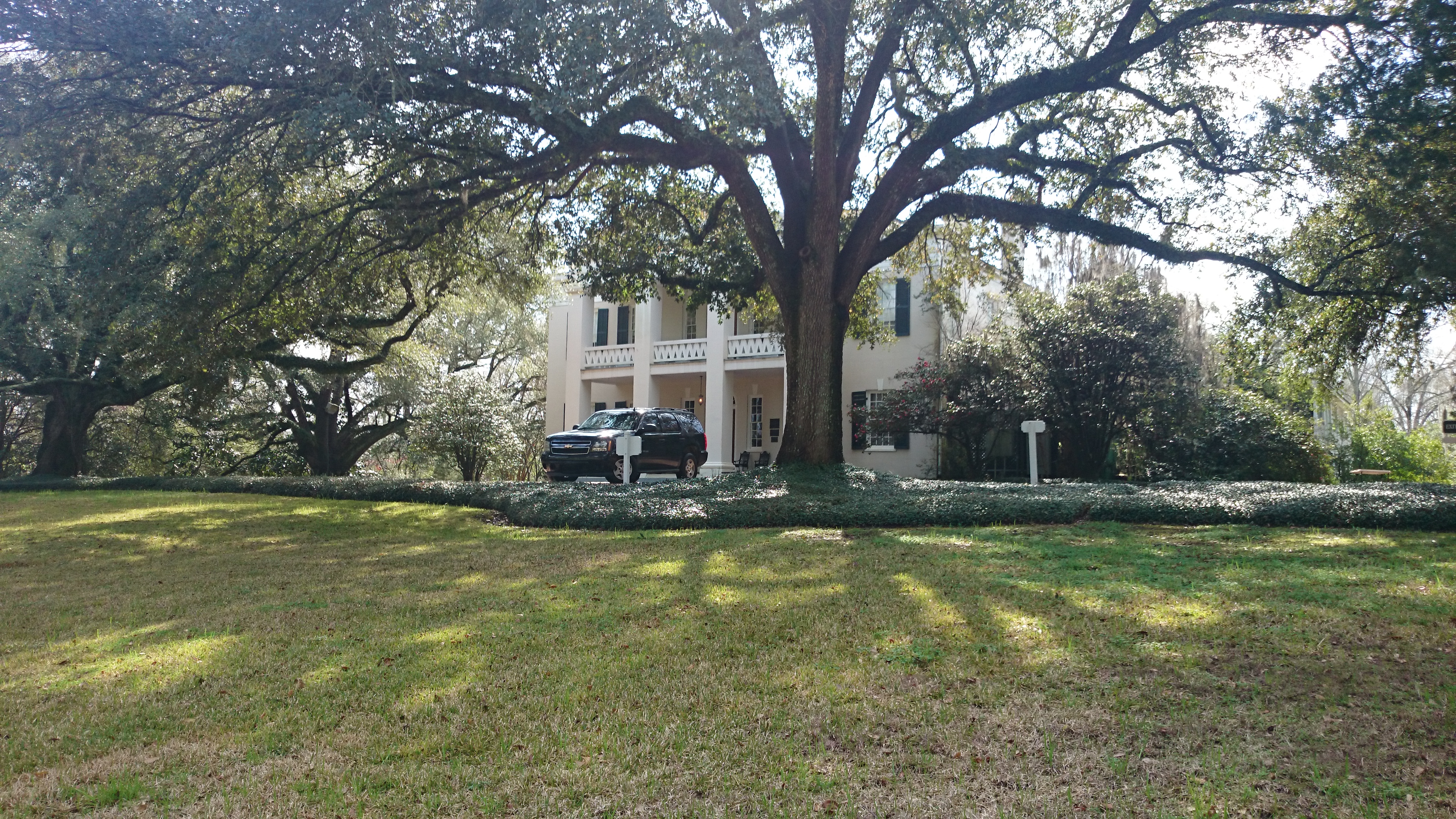 Both the US and the Bonnie Blue Flag adorn this mansion
